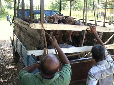 Above and below: Year-old Jersey-Sahiwal hybrid heifers begin their journey from Polonnaruwa to orphanages of the East Coast on 3 June 2006. |