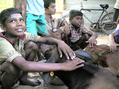 Children of Manikkavasagar Boys' Home in Santhively (above) and Swami Vipulananda Boys' Home in Palugamam (below) with the yearling heifers delivered to their homes by project volunteers on 3 June 2006. Two of the four heifers delivered to Swami Vipulananda Boys' Home will provide milk for Sri Kanaga Durgai Amman Girls' Home in Palugamam. From the age of two years the heifers will be capable of producing milk. | |||||||||||||||||||||